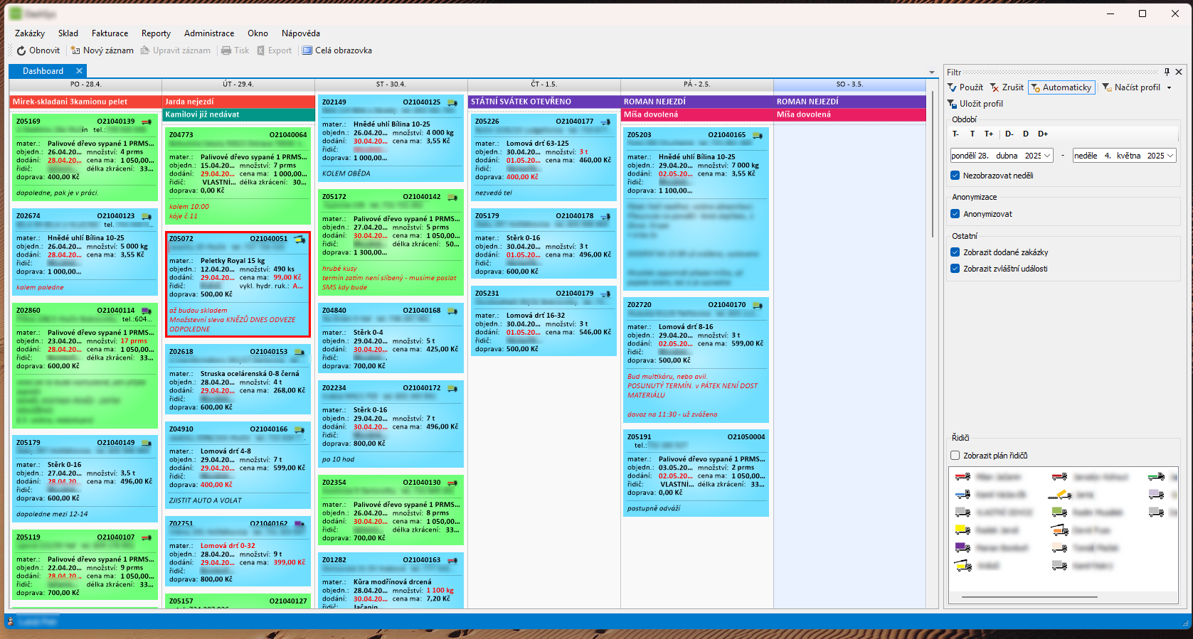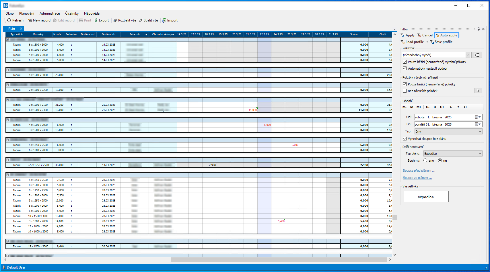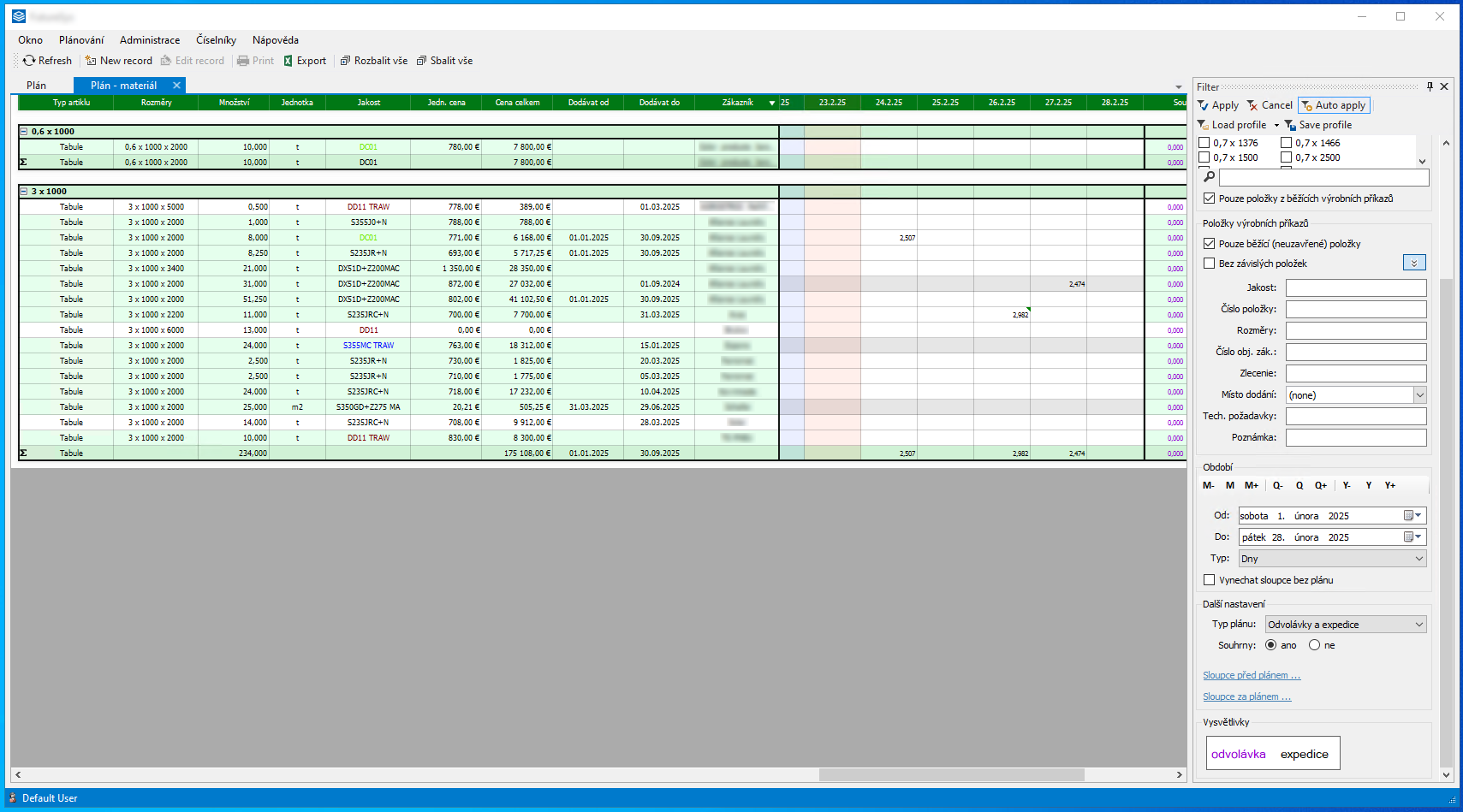 Sledování objednávek materiálu, plánování odvolávek a expedicí s důrazem na přehlednost a snadné ovládání, kombinace pohledů na plánovaná data z různých perspektiv.
